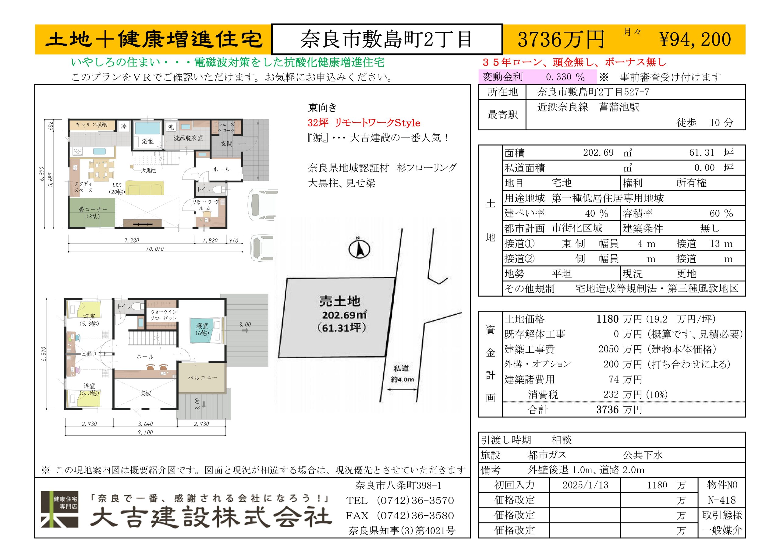| 土地面積 | 202.69㎡ 61.31坪 | 土地価格 | 1180万円 |