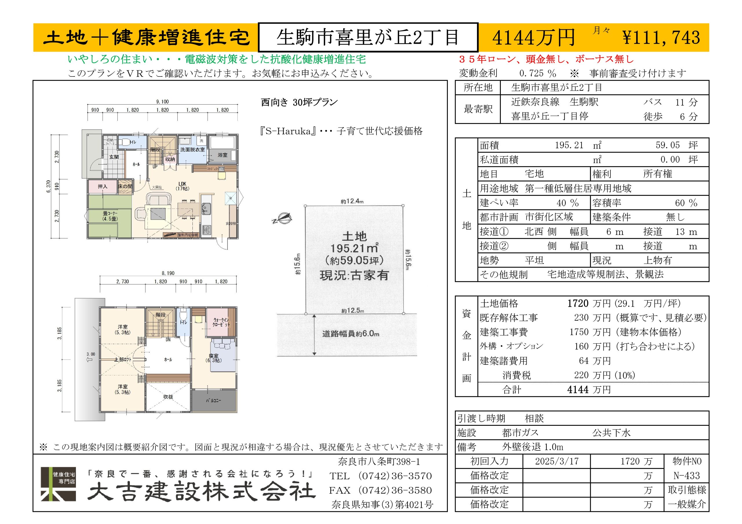 | 土地面積 | 195.21㎡ 59.05坪 | 土地価格 | 1720万円 |