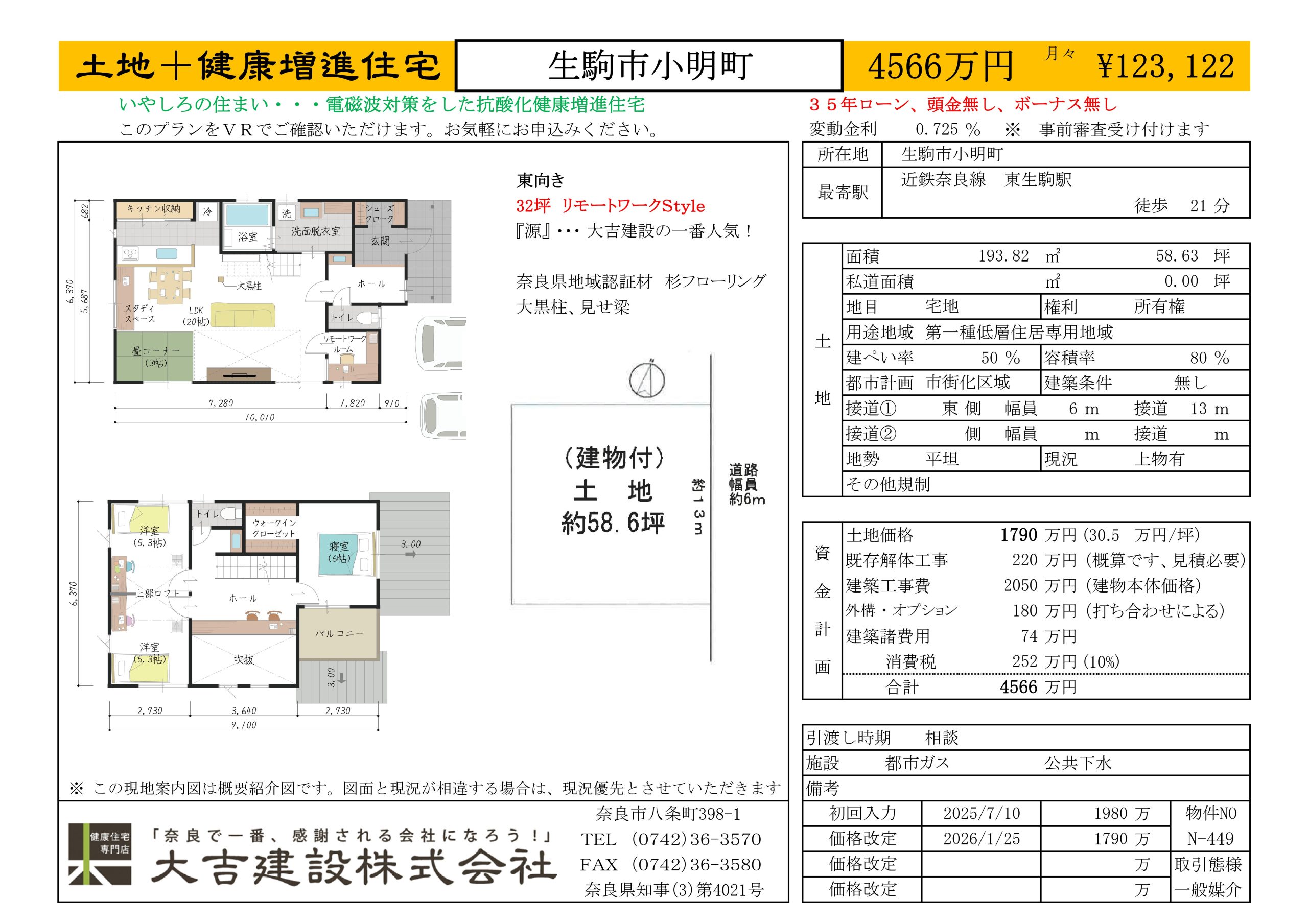 | 土地面積 | 193.82㎡ 58.63坪 | 土地価格 | 1790万円 |